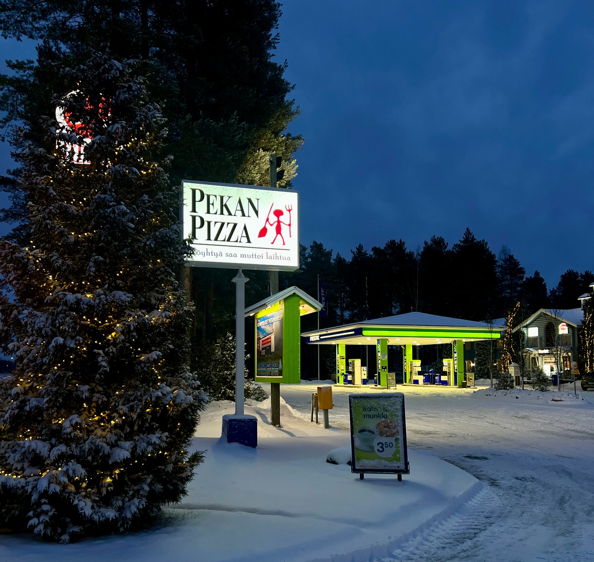 Pari päivää ennen vuoden vaihdetta vietettiin Revonlahden Pekan Pizzan avajaisia Neste Revonlahdella. Valmisteluja oli tehty marraskuun alusta alkaen ja kaikki aikataulujen askelmerkit olivat napsahtaneet kohdalleen. Kälviältä saavuimme auttamaan kahdeksi ensimäiseksi päiväksi. Kuinka upealta näyttikään Pekan Pizza -näkyvyys piha-alueen aamukajossa! Sisätiloissa pitsantilauspaikka ja sali pöytämainoksineen olivat juuri sitä, mitä olimme suunnitelleet. Hyvällä mielellä aloimme odottamaan ensimmäisiä asiakkaita yhdessä Revonlahden Pekan Pizzan henkilökunnan kanssa.